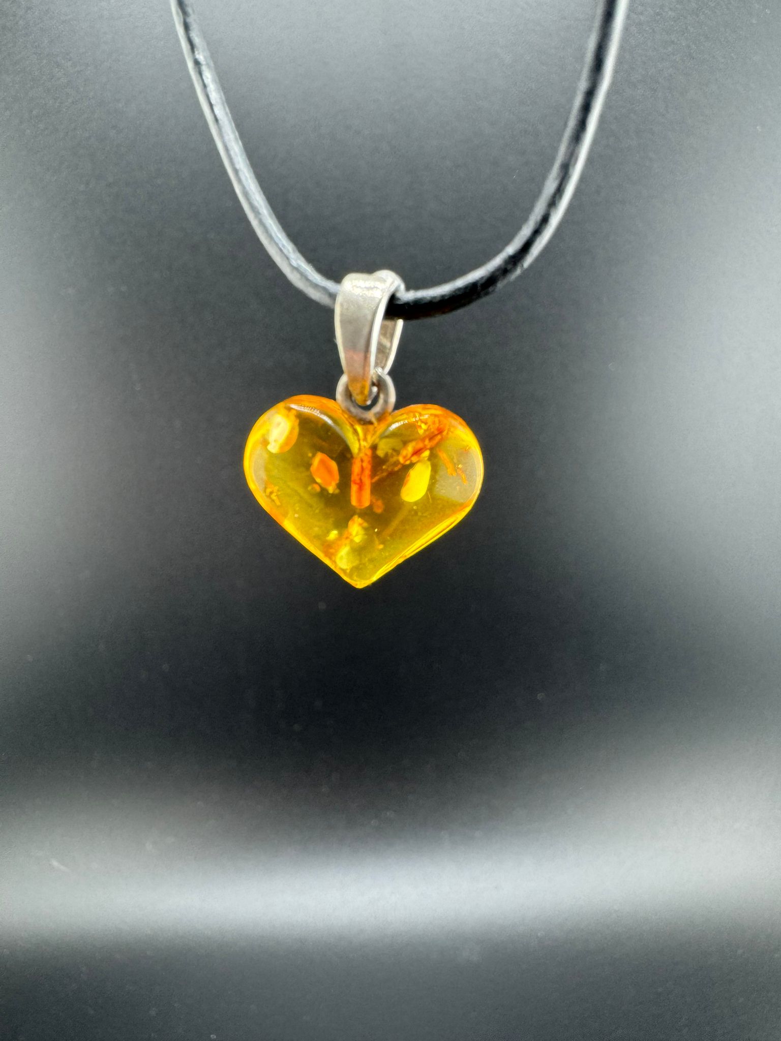 Sehr schönes Bernstein-Herz, sehr klarer Bernstein mit glitzernden Facetten.