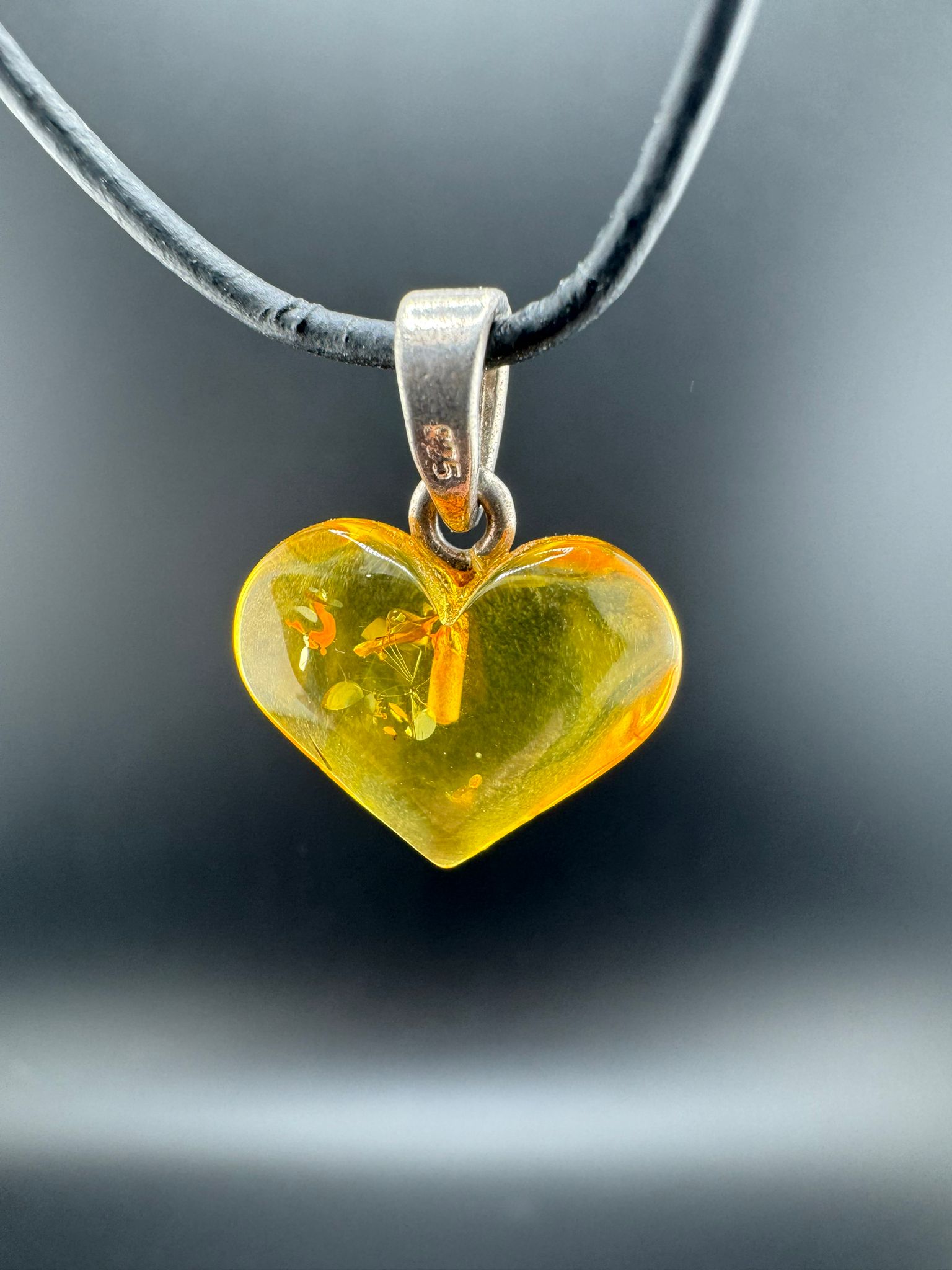 Sehr schönes Bernstein-Herz, sehr klarer Bernstein mit glitzernden Facetten.