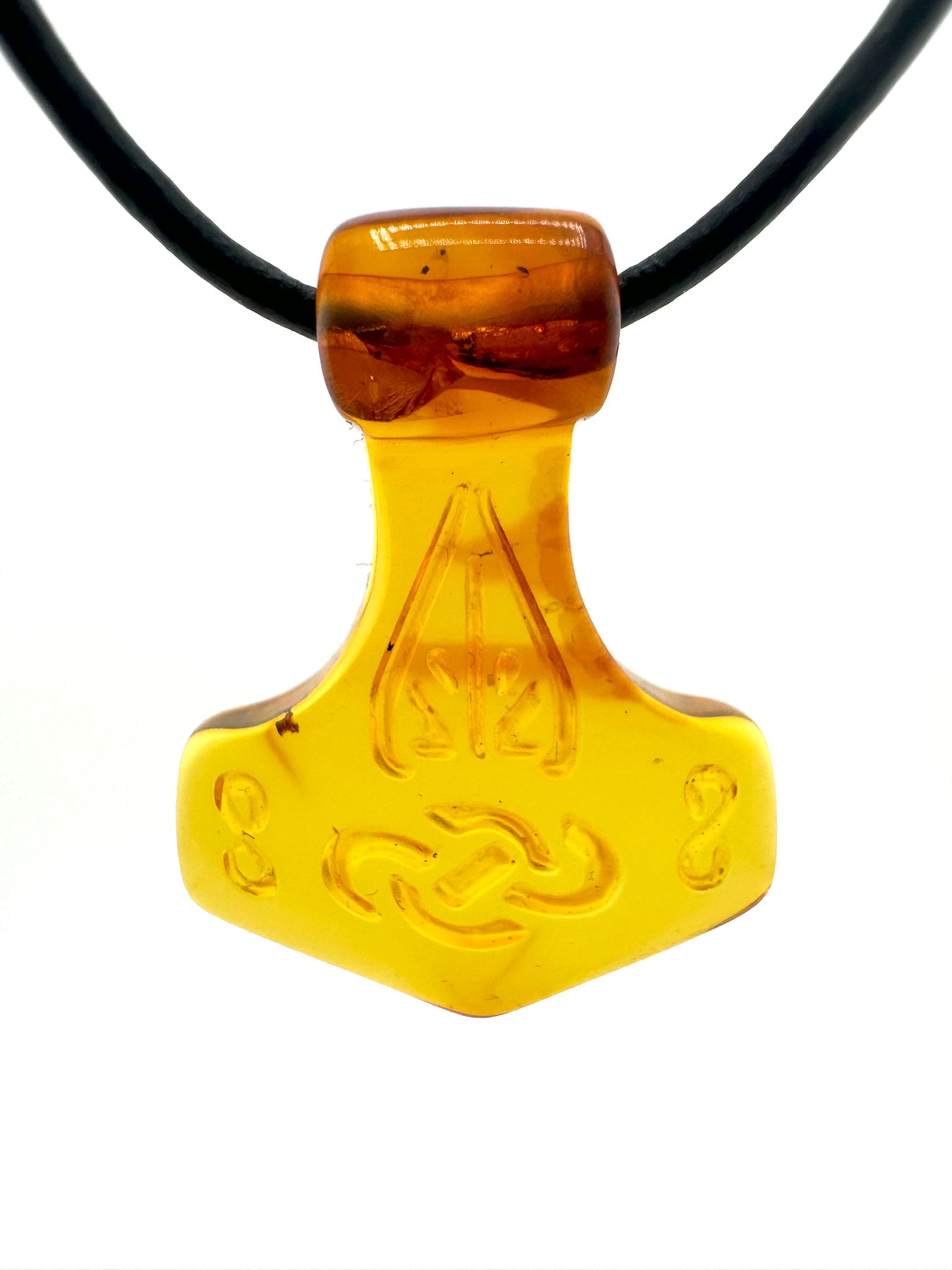 Erwecken Sie den Mut und die Stärke des nordischen Gottes Thor mit unserem handgefertigten Bernstein Thorshammer. Der echte Bernstein wird in einer Ornamentik von 29mm Höhe und 22mm Breite kunstvoll eingesetzt. Ein kraftvolles Accessoire, das Sie bei Ihren Abenteuern begleiten wird!