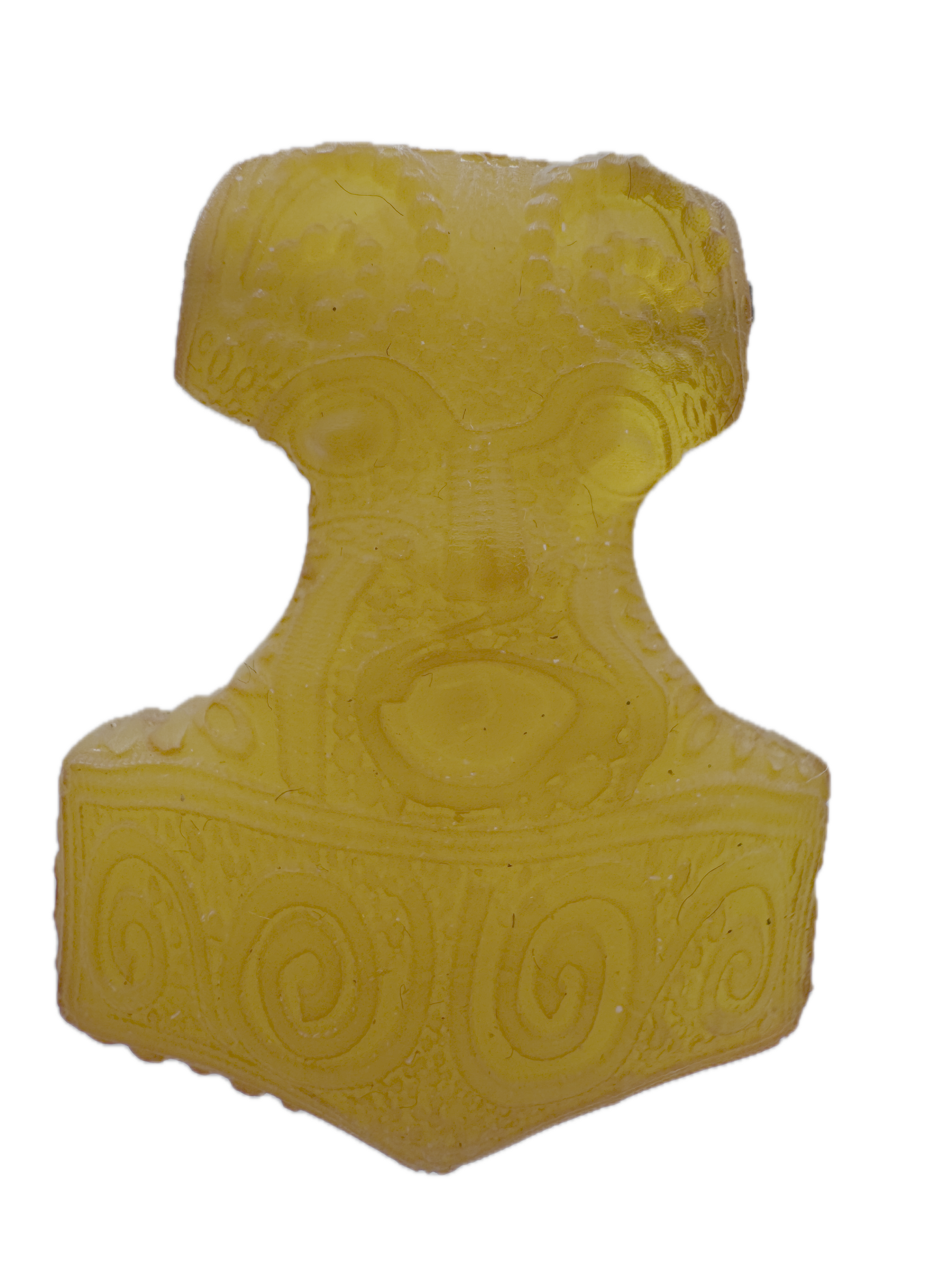Dieser großformatige Thorshammer aus echtem Bernstein ist ein absolutes Einzelstück. In sorgfältiger Handarbeit gefertigt, überzeugt das Schmuckstück durch seine markante Formgebung und die klar ausgearbeiteten Gravuren. Besonders ins Auge fallen die spiralförmigen Ornamente im unteren Bereich, die symmetrischen Linien im Mittelteil, sowie die fein strukturierte Oberfläche, die dem Anhänger Tiefe und Charakter verleiht.