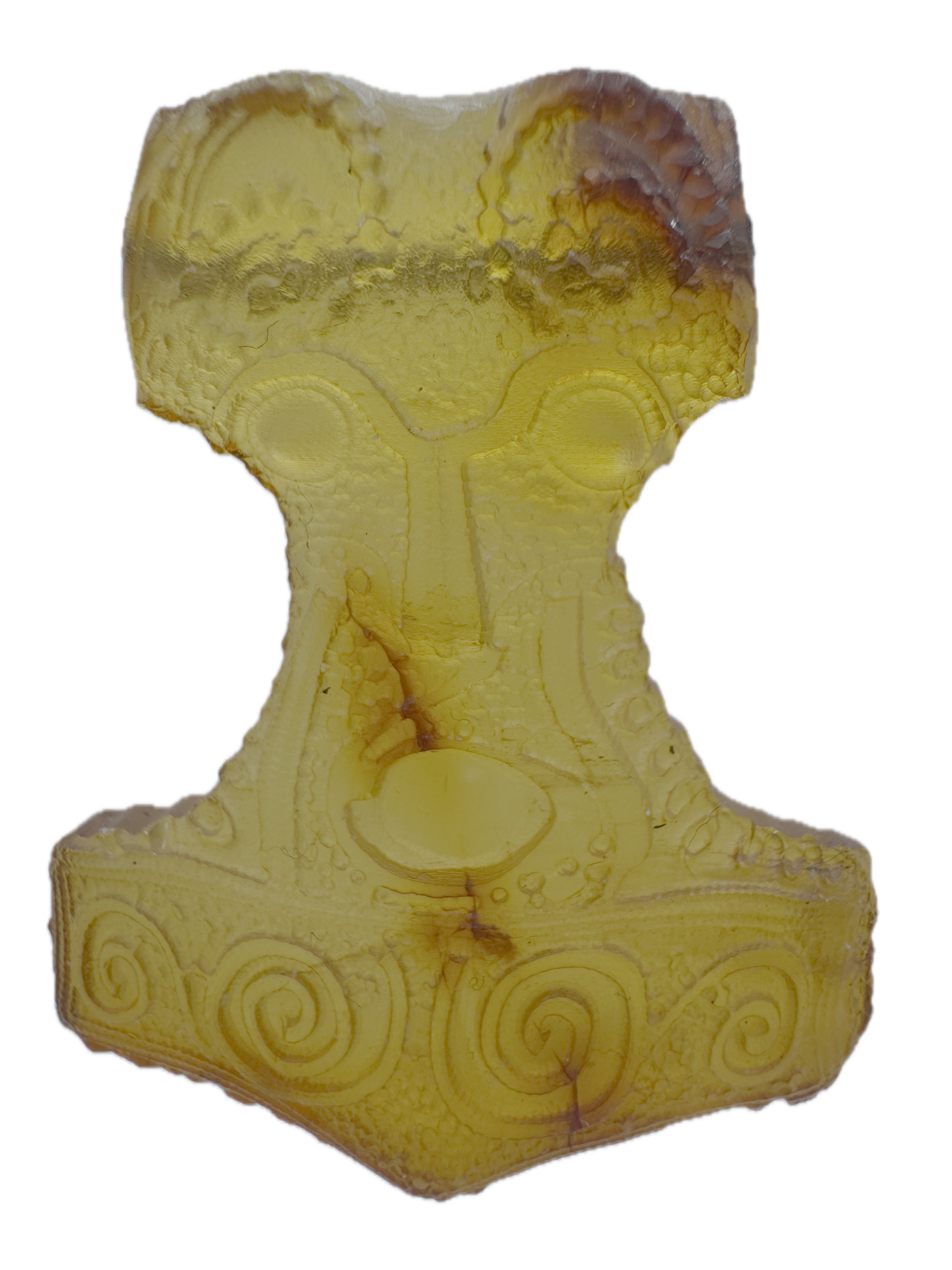 Dieser großformatige Thorshammer aus echtem Bernstein ist ein absolutes Einzelstück. In sorgfältiger Handarbeit gefertigt, überzeugt das Schmuckstück durch seine markante Formgebung und die klar ausgearbeiteten Gravuren. Besonders ins Auge fallen die spiralförmigen Ornamente im unteren Bereich, die symmetrischen Linien im Mittelteil, sowie die fein strukturierte Oberfläche, die dem Anhänger Tiefe und Charakter verleiht.