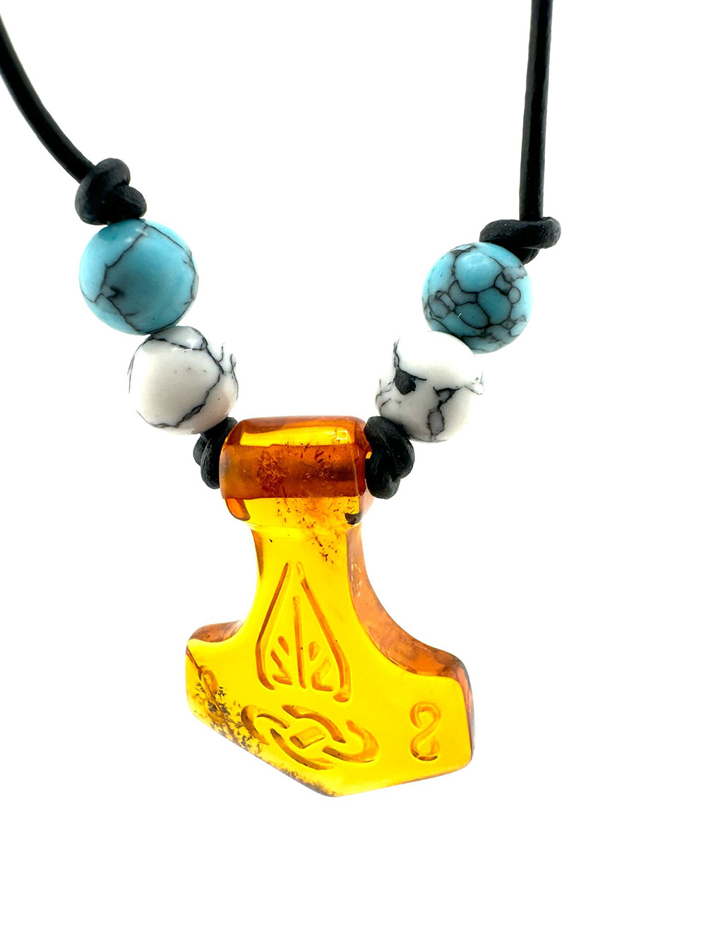 Die Halskette Thorshammer ist ein exklusives Schmuckstück mit vier edlen Bernstein Steinperlen. Der prächtige Thorshammer Anhänger ist auf einem eleganten und langen Lederband befestigt, das eine Länge von einem Meter hat. Ein einzigartiges Accessoire, das Ihrem Outfit eine luxuriöse Note verleiht. Perfekt für jeden Anlass.