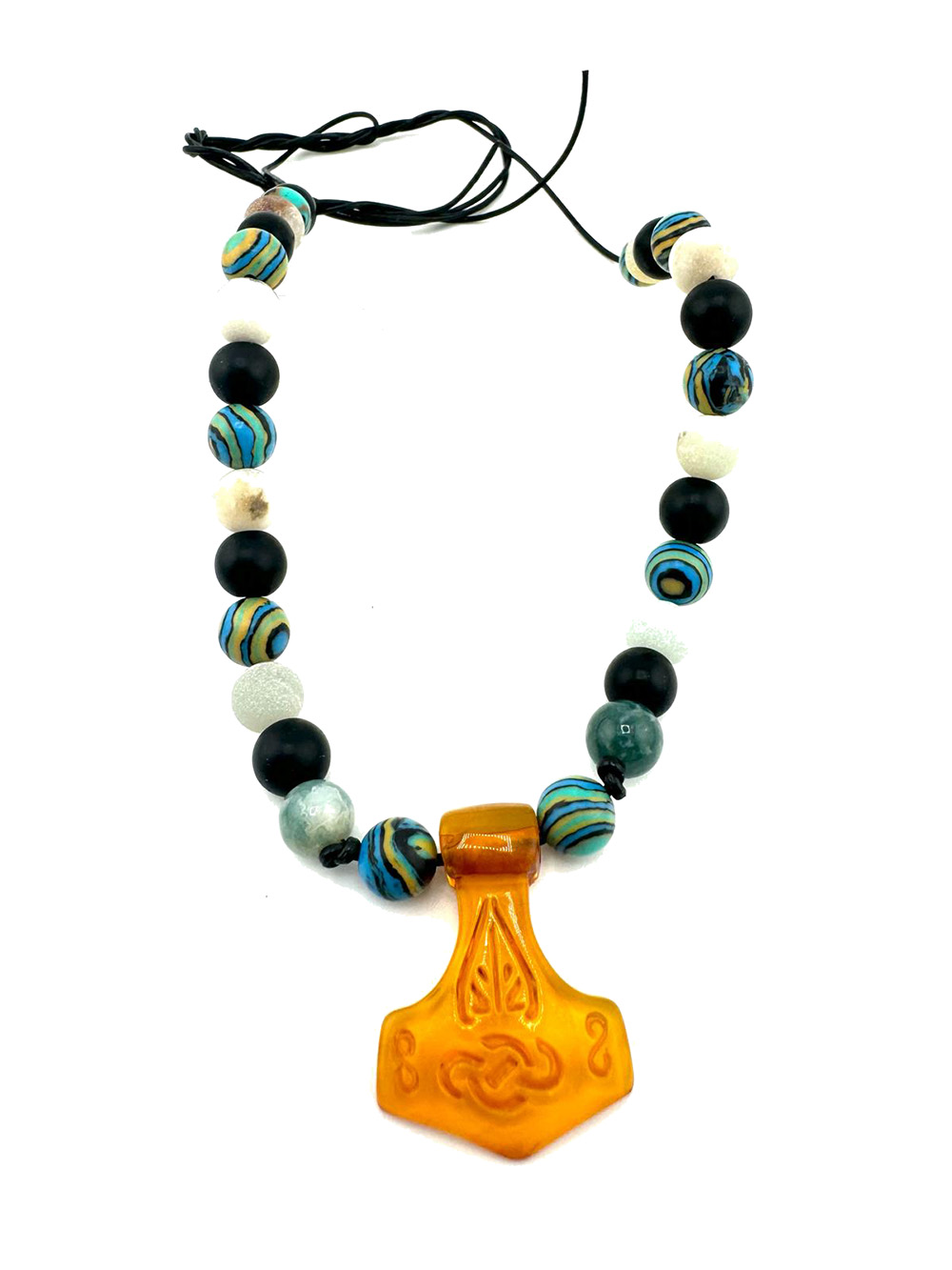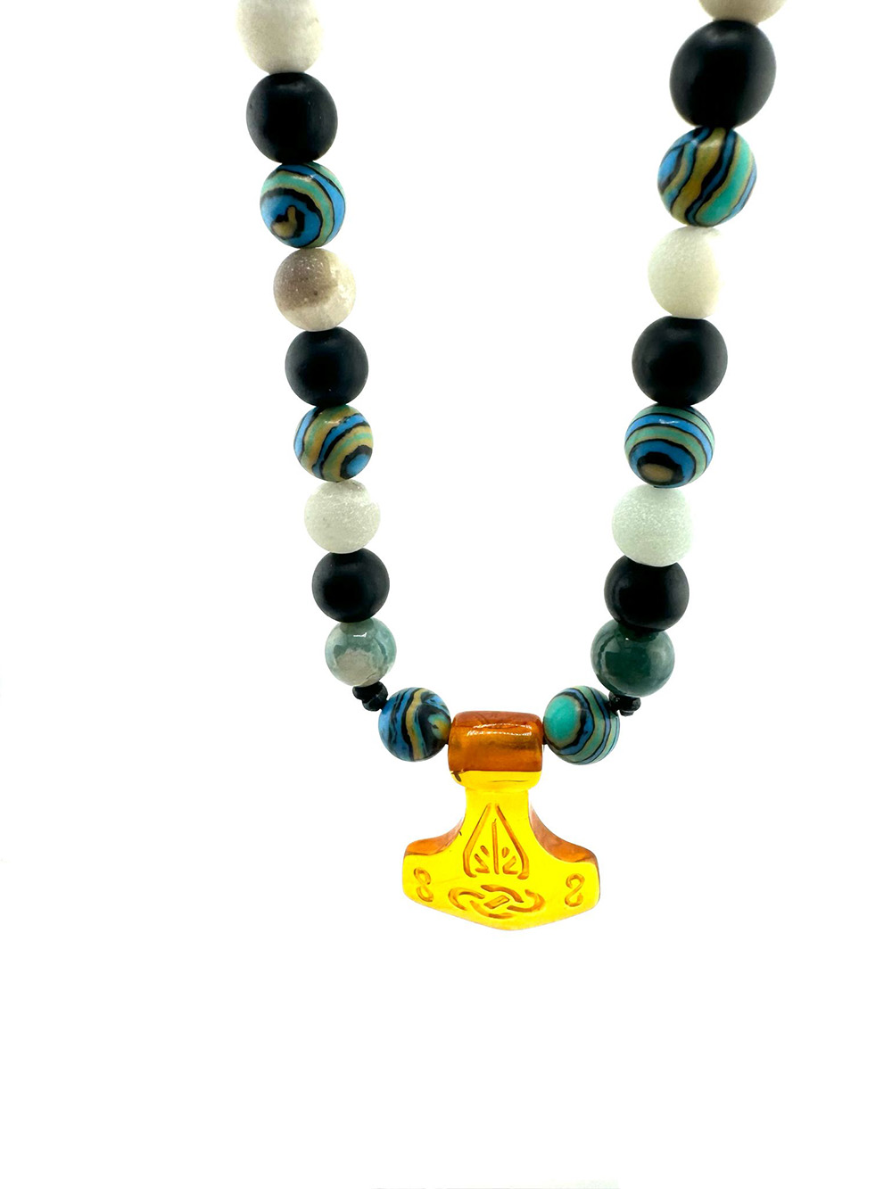 Verleihen Sie Ihrem Look mit dieser exquisiten Halskette eine Hauch von Mythologie und Schönheit. Der Thorshammer aus Bernstein und 30 edlen Steinperlen sind am langen Lederband von einem Meter Länge befestigt. Ein atemberaubendes Accessoire für den anspruchsvollen Geschmack.