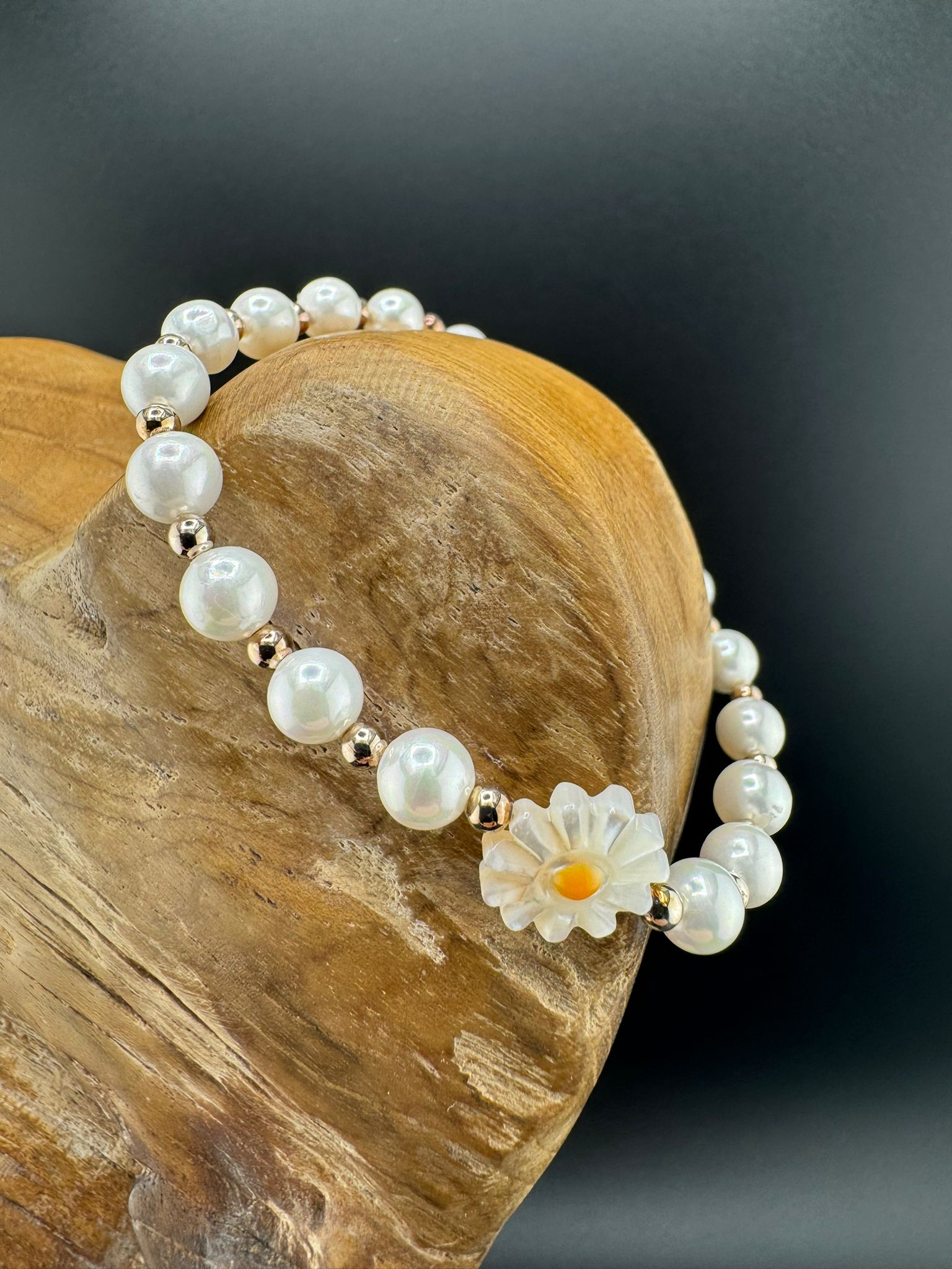 Perlenarmband mit echten 925er Silberperlen zwischen den Perlmutt Perlen und einer Blüte.
